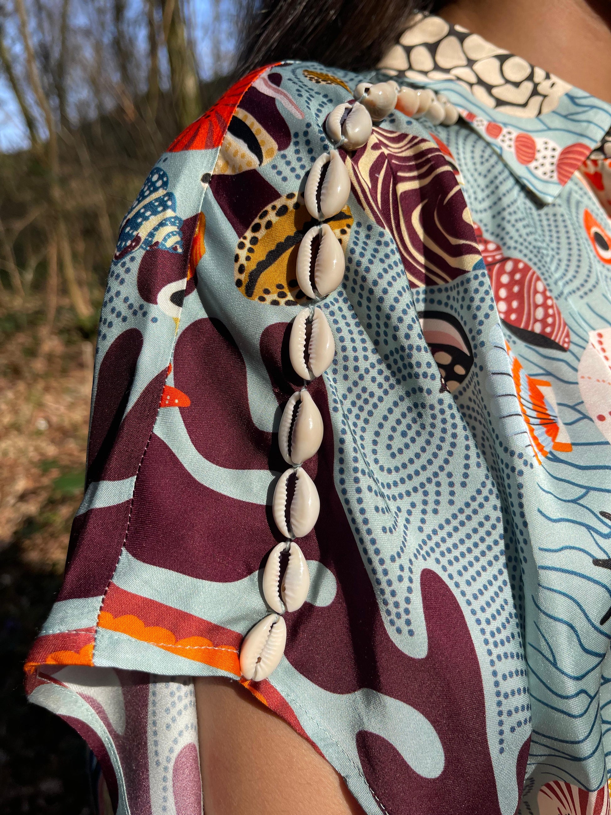 La chemise Maddy s'impose avec son imprimé marin spectaculaire qui capture instantanément l'attention. Son univers vibrant mêle coquillages, coraux et créatures marines dans une composition hypnotique et colorée. Coupe ample et fluide, manches courtes larges inspirées du kimono, petit col structuré — chaque détail a été pensé pour allier confort maximal et style sans effort. La ligne de cauris signature soulignant les épaules ajoute une touche estivale et artistique unique. Cet imprimé CORAL exclusif aux teintes riches — bleu, chocolat, ocre, orange, jaune, bleu foncé — transforme instantanément un look simple en tenue ultra mode. Une pièce forte et affirmée, parfaite pour l'été.