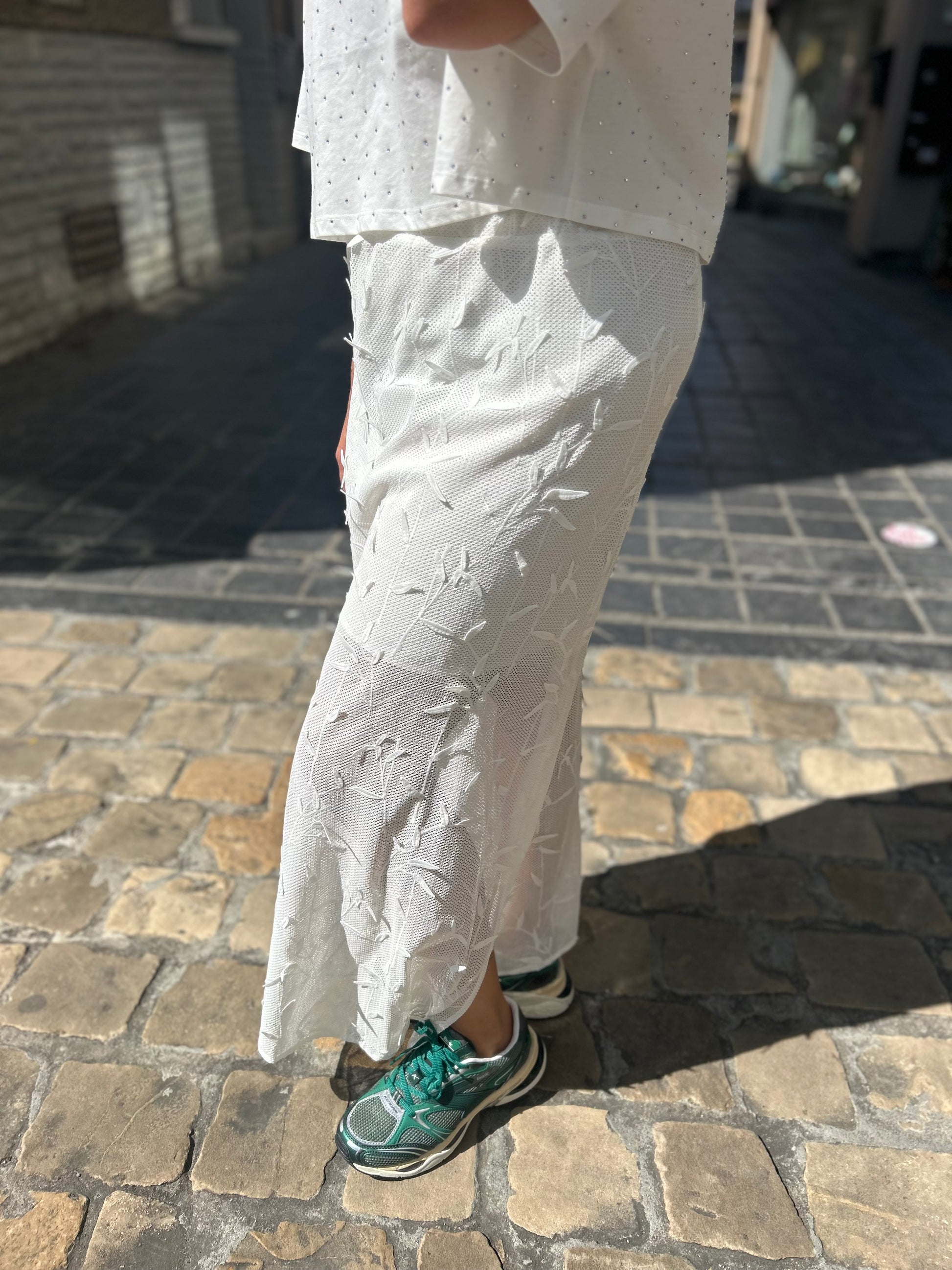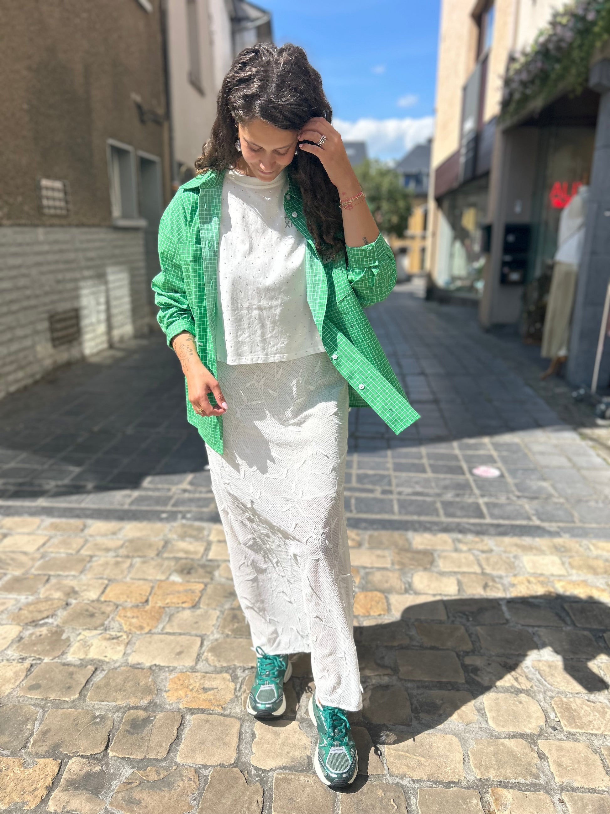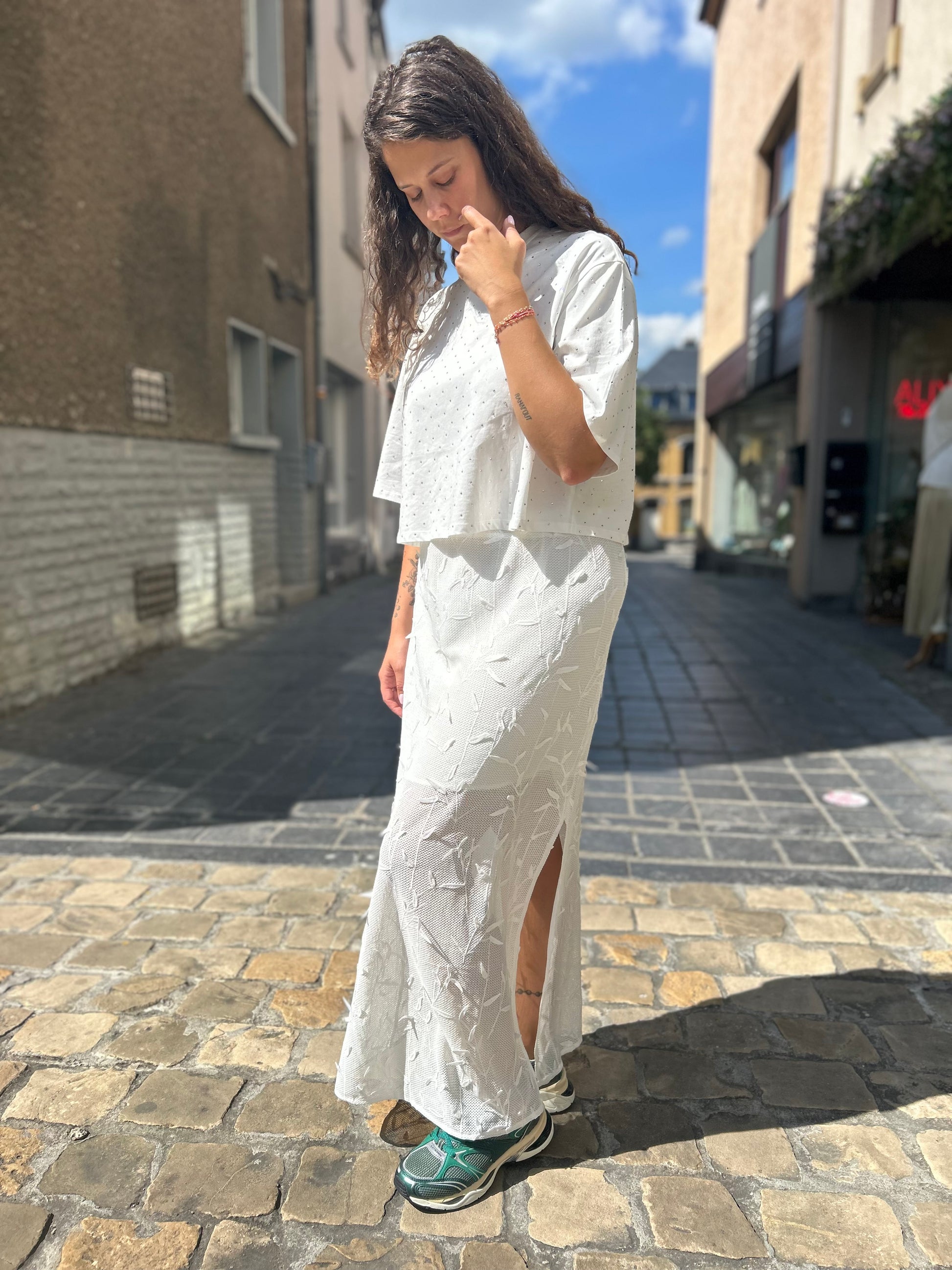Quand la féminité rencontre modernité, ça donne Villemin : une jupe longue, délicate et audacieusement transparente là où il faut.