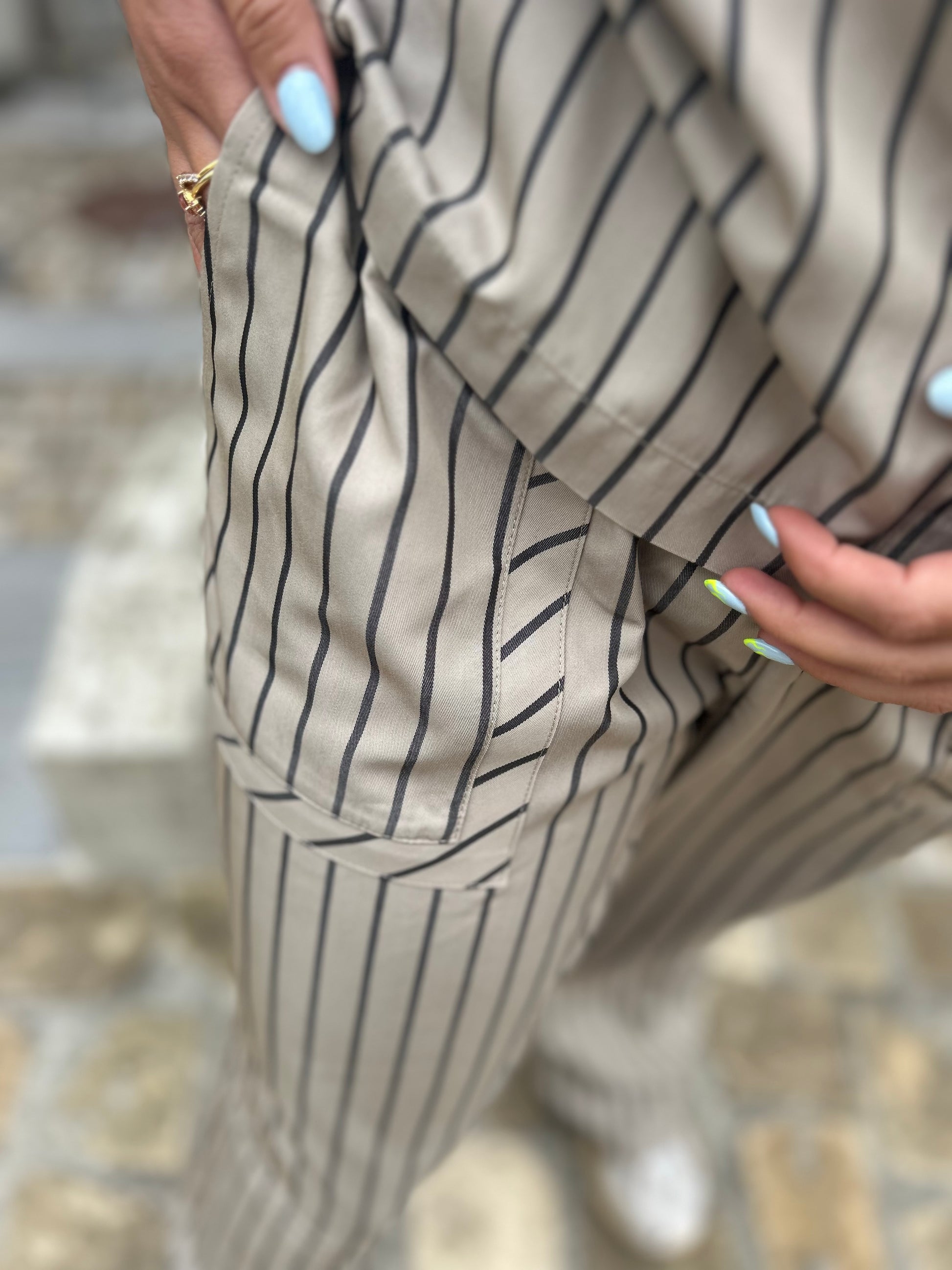 Le pantalon Mia est confectionné dans un tissu fluide et léger avec des rayures verticales brunes, sur fond beige foncé pour un effet texturé élégant.