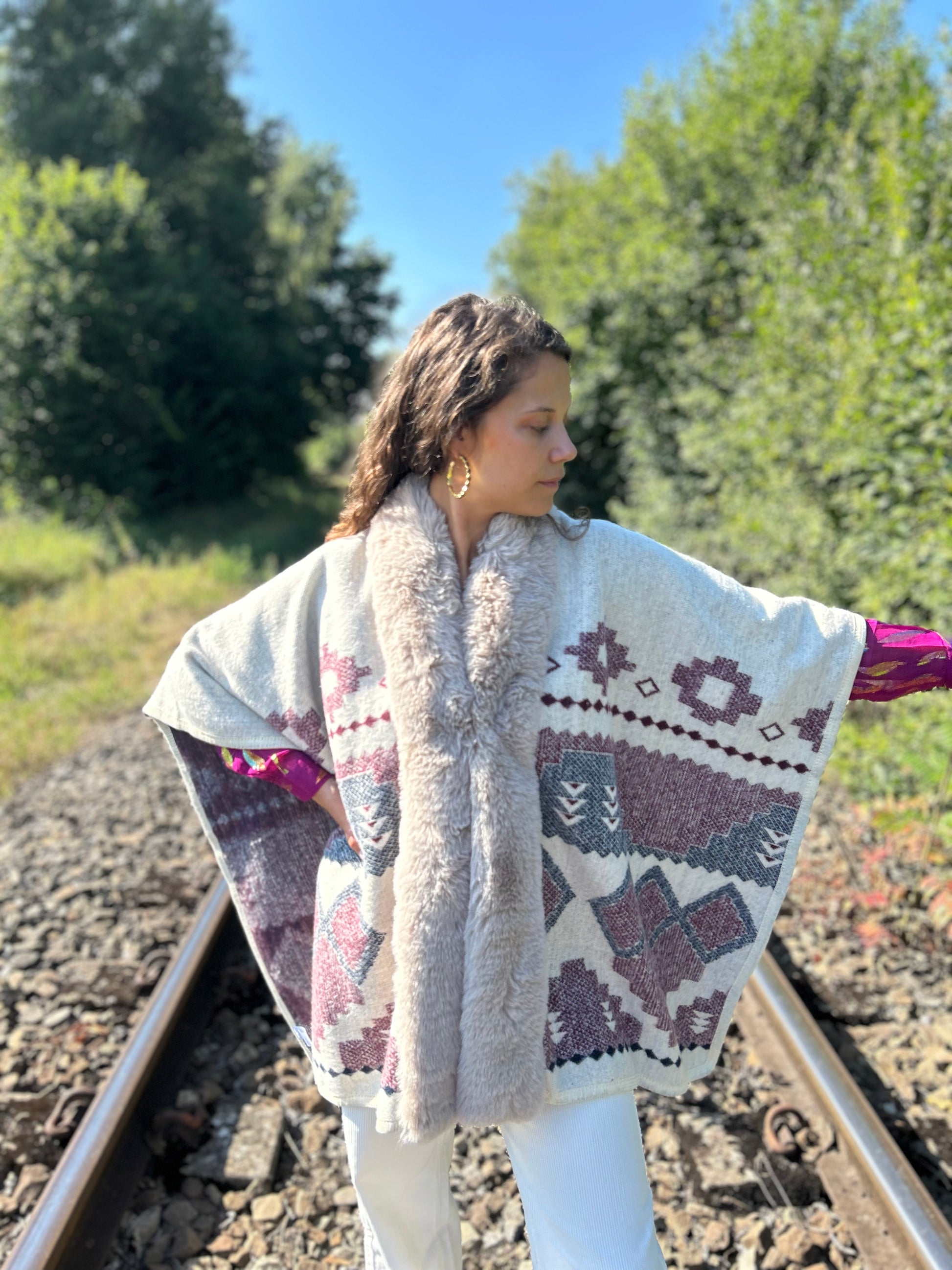 Le poncho Percy incarne l’élégance hivernale avec son jacquard beige orné de motifs navajos aux teintes bordeaux et bleues. Sa coupe asymétrique raffinée, plus courte à l’avant, met en valeur la silhouette tout en assurant confort et liberté de mouvement. La fausse fourrure beige soulignant le col et la fermeture offre une chaleur enveloppante et une touche sophistiquée, faisant de cette pièce un incontournable pour affronter la saison avec style et aisance.