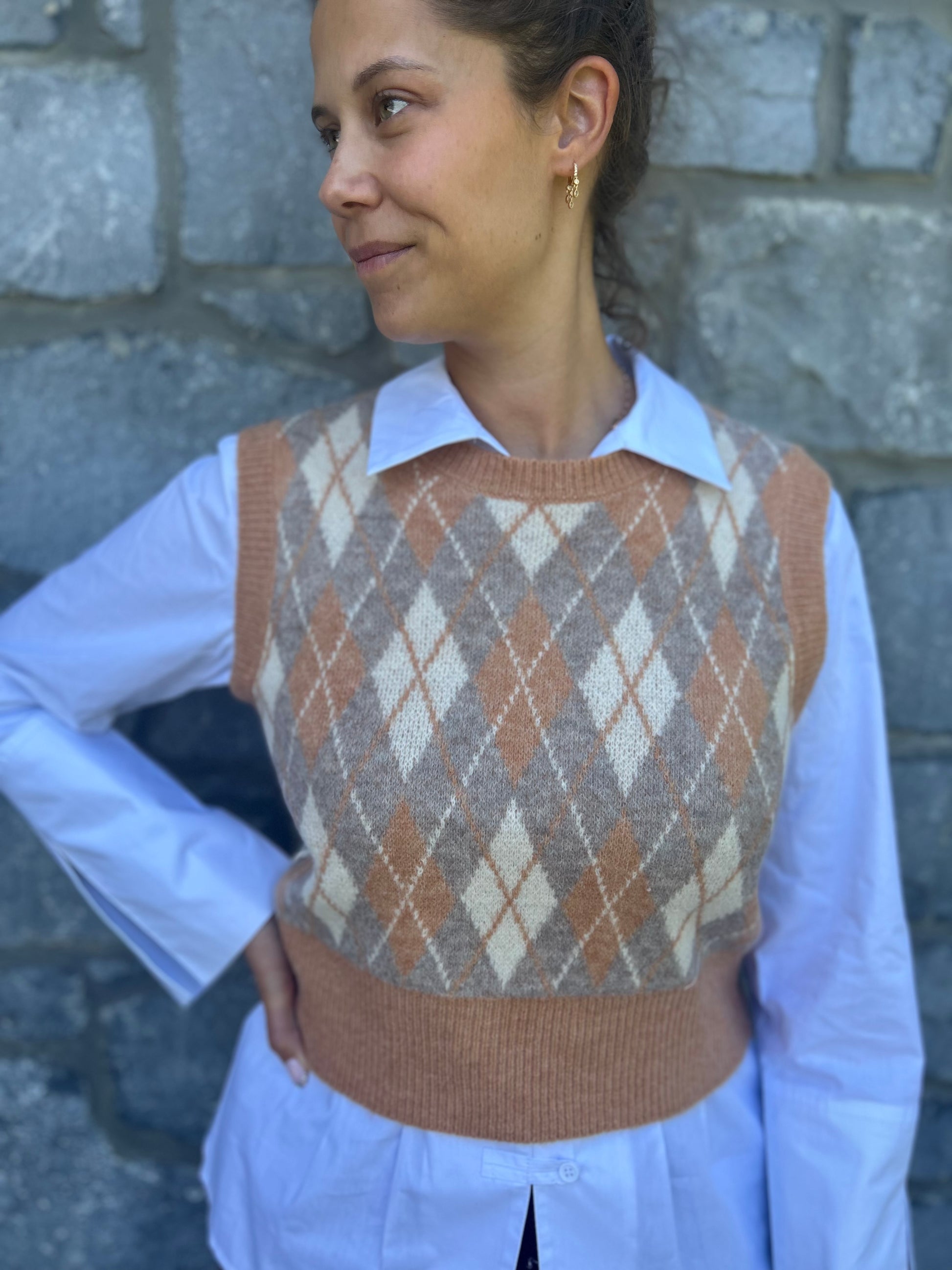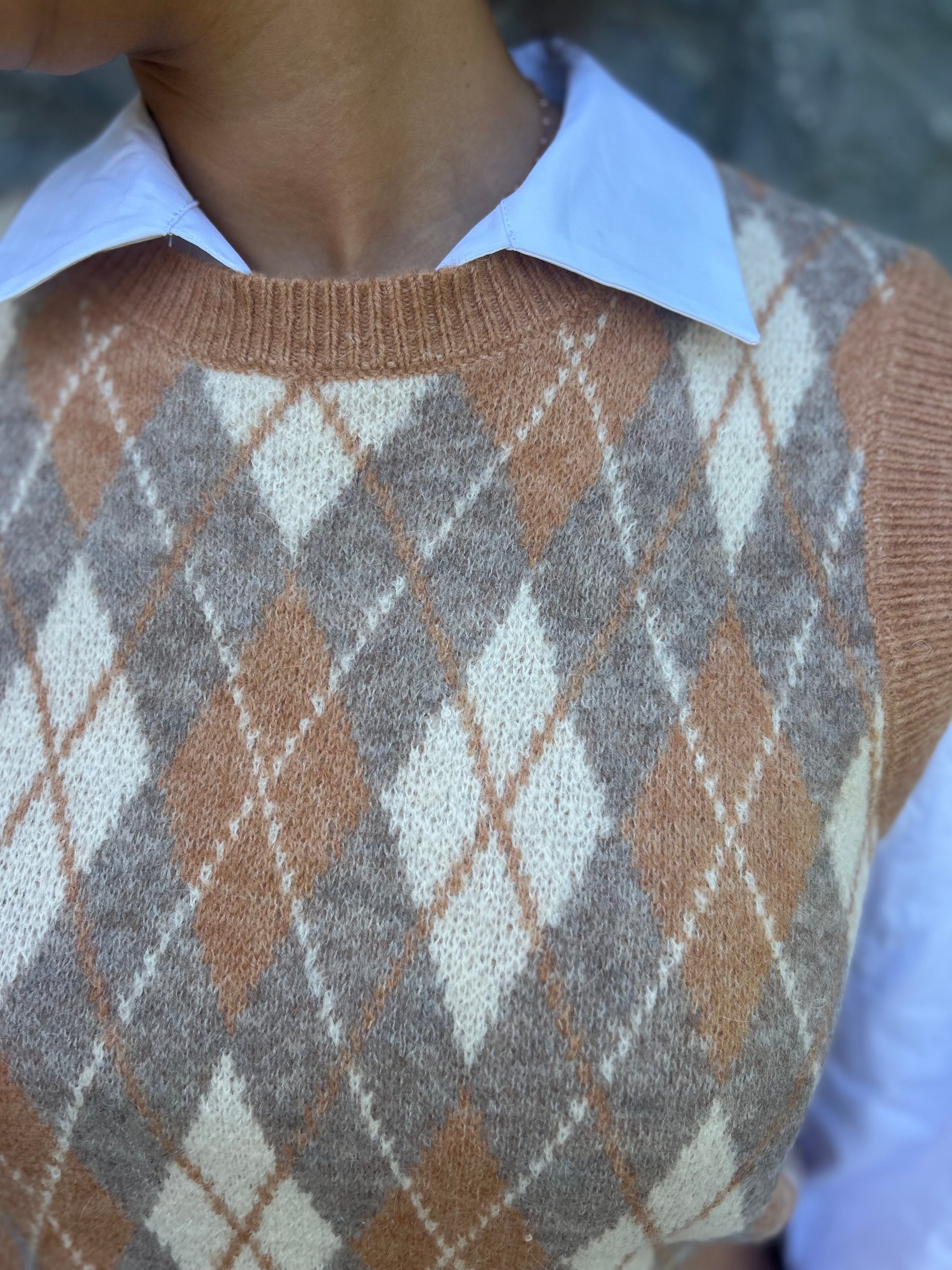 Le pull Philo est un débardeur sans manches en laine qui mise sur un motif à carreaux argyle délicatement nuancé. Sa coupe ajustée à la taille et son encolure ras du cou offrent un équilibre parfait entre confort et élégance. Doté de finitions côtelées, ce pull casual se prête idéalement au layering sur une chemise blanche ou se porte seul pour un look contemporain, polyvalent et raffiné.