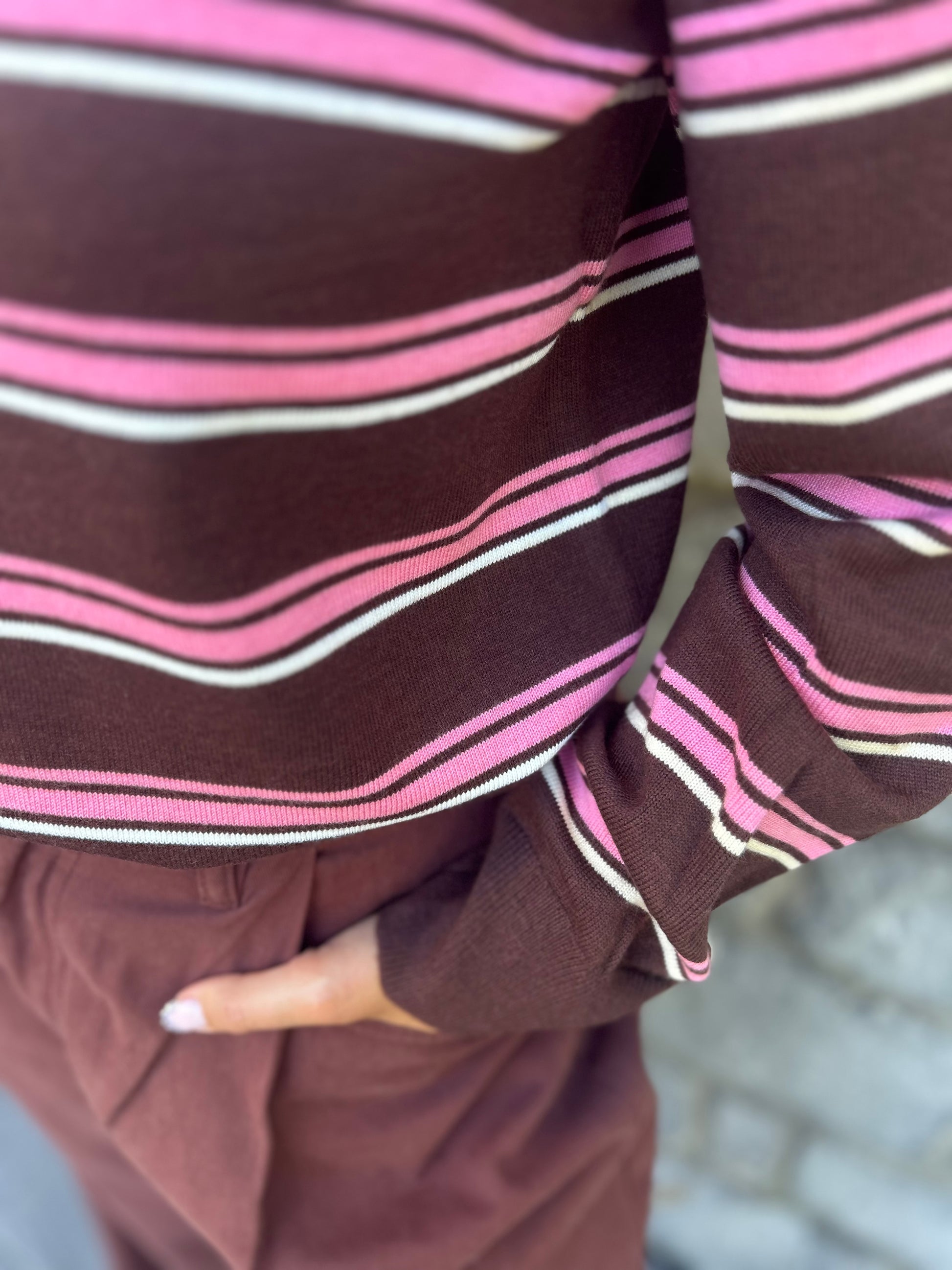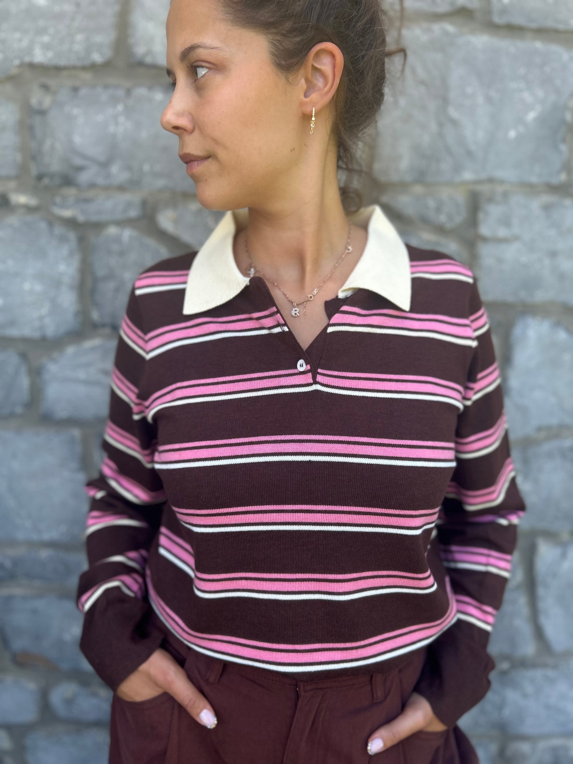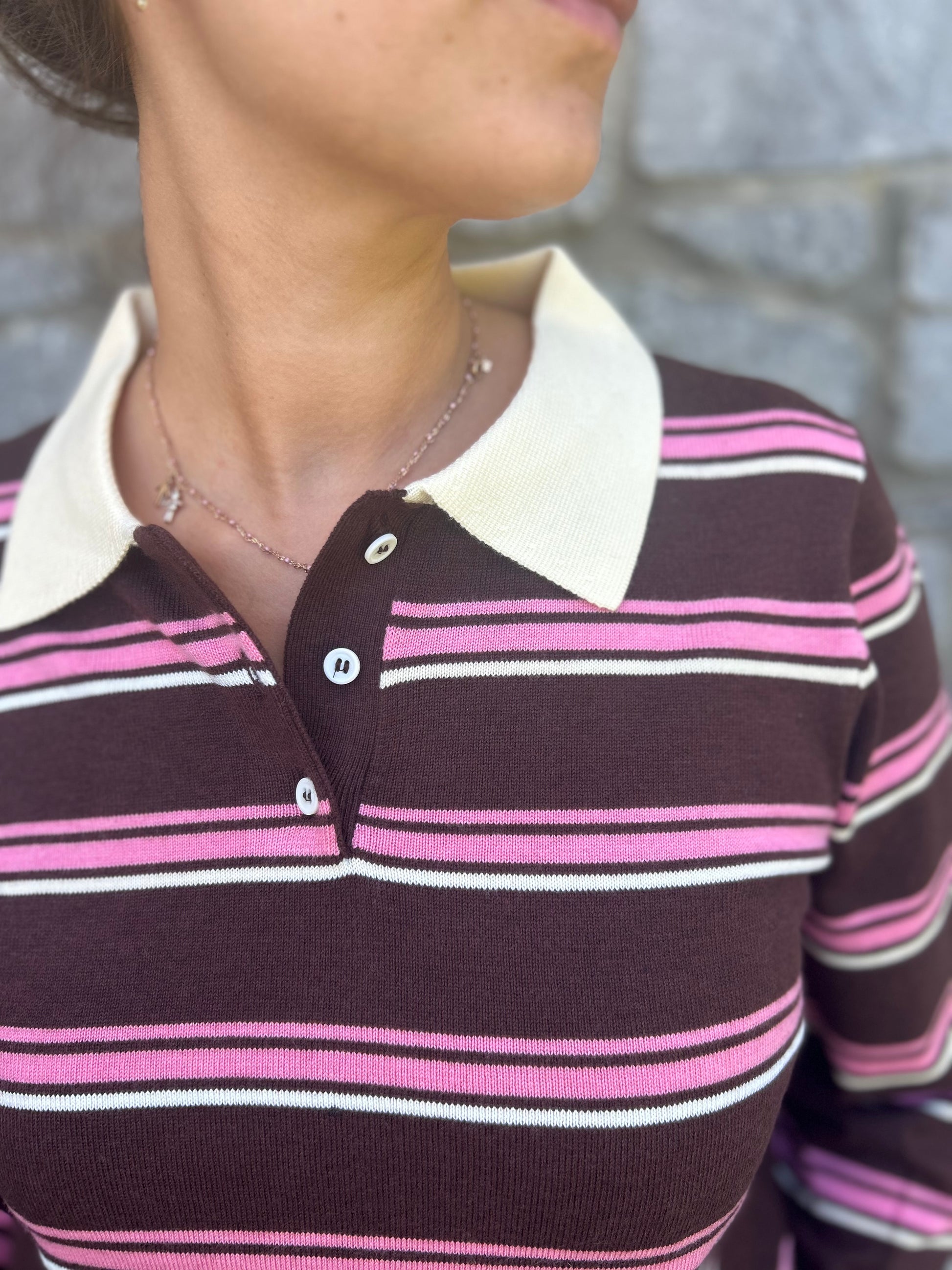 Le pull Prego, une élégance décontractée qui twiste l'intemporel col polo avec l'énergie des rayures.
