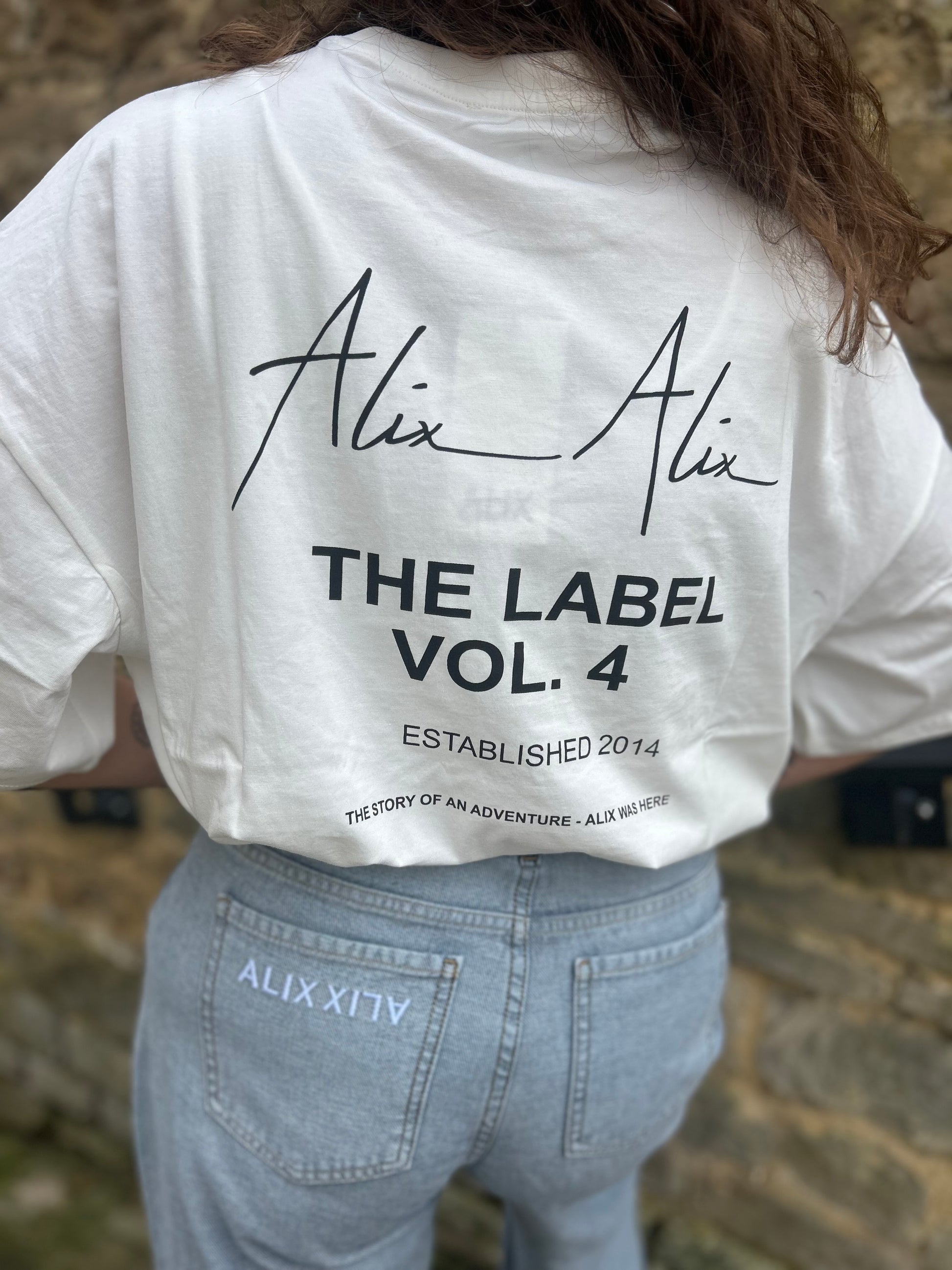 Sur l'avant, un taureau brodé signe discrètement la pièce, tandis que le dos dévoile un imposant imprimé ALIX THE LABEL VOL. 4, véritable statement visuel. Avec son col rond côtelé, ses manches courtes et son fini blanc éclatant, ce tee-shirt devient un incontournable du vestiaire contemporain.
