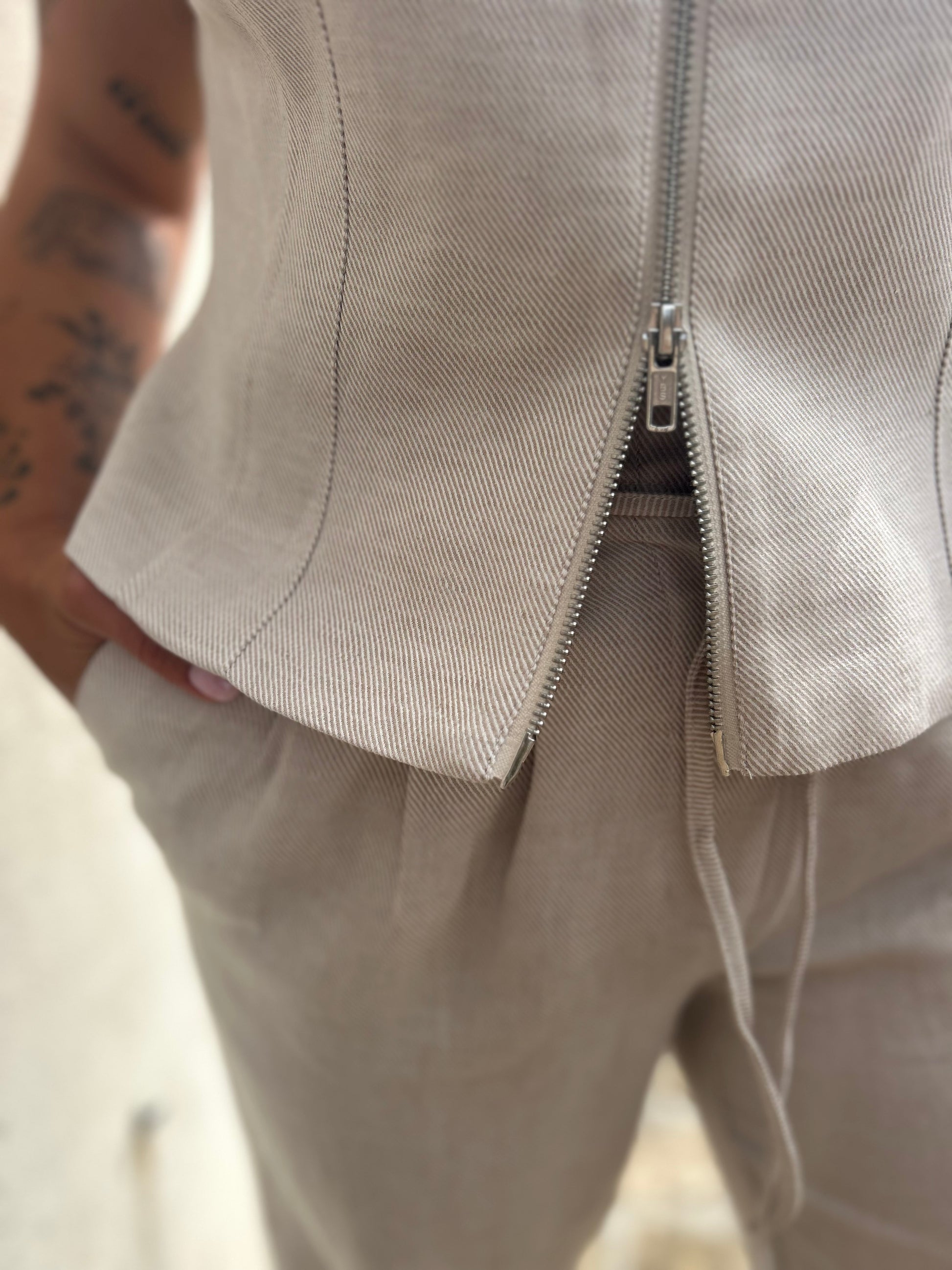 Le top Via a tout bon. Taillé dans un lin beige naturel, il allie allure structurée et matière estivale respirante.