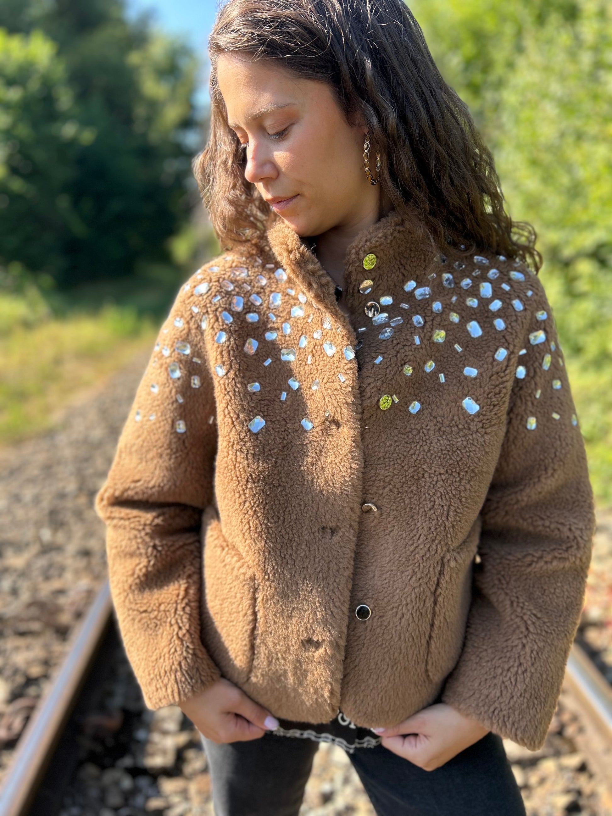 La veste Marcos allie élégance et chaleur grâce à sa fausse fourrure en mouton retourné, idéale pour affronter l’hiver avec style. Son brun chocolat aux reflets marron glacé souligne une silhouette contemporaine, sublimée par une coupe légèrement large et un col montant structurant. Les poches plaquées ajoutent une touche de fonctionnalité raffinée, tandis que les boutons argentés et strass rivés apportent une note précieuse et dynamique, faisant de cette pièce audacieuse un incontournable du vestiaire moderne.